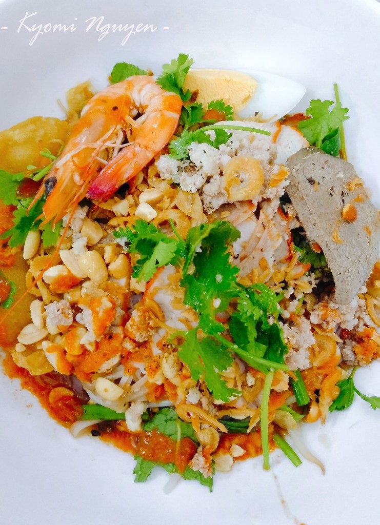 Phần ăn bao gồm một bát nhỏ nhiều viên sủi cảo chan nước dùng nóng hổi bên cạnh cái tô to đùng chứa tổng hợp nguyên liệu nào lạc, nào hành phi, nào rau mùi, nào tôm, nào trứng, nào há cảo, và có cả vài ba miếng thịt rất hấp dẫn nữa. Tôi hài lòng trộn đều các thứ lên và bắt đầu thưởng thức bữa tối muộn trong ngày, tạm bỏ qua ý nghĩ sẽ tăng cân trong vòng vài nốt nhạc.